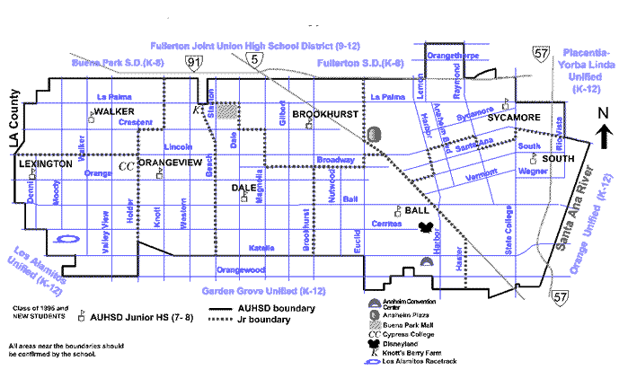 The Anaheim Union High School District prohibits discrimination, intimidation, harassment (including sexual harassment) or bullying based on a person’s actual or perceived ancestry, color, disability, gender, gender identity, gender expression, immigration status, nationality, race or ethnicity, religion, sex, sexual orientation, or association with a person or a group with one or more of these actual or perceived characteristics in its programs or activities and provides equal access to the Boy Scouts and other designated youth groups. The following employees have been designated to handle questions and complaints of alleged discrimination: Title IX Coordinator for Students: TitleIX@auhsd.us and (714)999-5621; Equity Compliance Officer for Students: EquityComplianceOfficer@auhsd.us and (714)999-5621; 504 Coordinator: 504Coordinator@auhsd.us and (714)999-5408.
